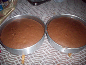 ahora ponemos en dos moldes de 9" o 10", previamente engrasados y con papel encerado al fondo, llevamos a hornear a 180 grados cent, o 350 far. por espacio de 40 a 45 minutos, no abrir el horno antes de 30 minutos